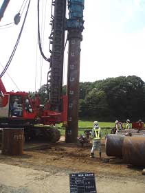 ![]() 写真1:衝撃載荷試験状況(養生後) ![]() 写真2:鋼管杭施工状況 |