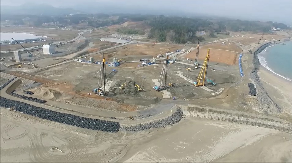 東北電力(株)女川原子力発電所では,既設設備の耐震性強化を目的とした安全対策工事を実施している。非常時の取水機能を担う取水口については,設計用地震動に対して耐震裕度を確保するため,地震時増分土圧低減を目的として,地盤改良工事を実施した。 地盤改良の仕様は,取水口躯体から21mの範囲において高圧噴射攪拌工(約11,600m3,GL-6m以深の砂質土を対象),取水口躯体の近傍はGL-6m以浅から地表までコンクリート置換(約2,000m3)とした。 本施工の課題として,高圧噴射攪拌工の範囲上部に捨石式傾斜堤(廃止設備)が埋設されており,施工時に捨石層の崩落が懸念された。そのため,薬液注入により捨石層を固化する崩落防止工を実施した。 また,施工上の配慮として,既設タイロッドや想定外の埋設物確認のための音響トモグラフィ探査・試掘による支障物調査の実施,海域への改良材リーク防止のための薬液注入,水質汚濁防止膜の設置を行った。 以上の対策により,施工品質の確保を図った。 |