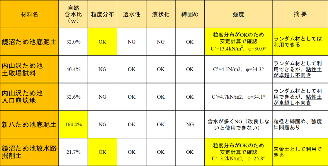 もう一つの事例は,令和4年8月山形・新潟県豪雨により破堤した鏡沼ため池の災害復旧事業である.比較検討により傾斜遮水ゾーン型(前刃金土)とし,堤体材料としては,池内及び近傍の土取り場で採取した全5試料を基に土質試験および配合試験を実施した上で,遮水ゾーン(刃金土)には放水路の掘削発生土,ランダムゾーンには池内の堆積土を盛土材として使用する計画とした.検討した堤体に対して安定計算を実施し,耐震性能が満足していることを確認した事例である.