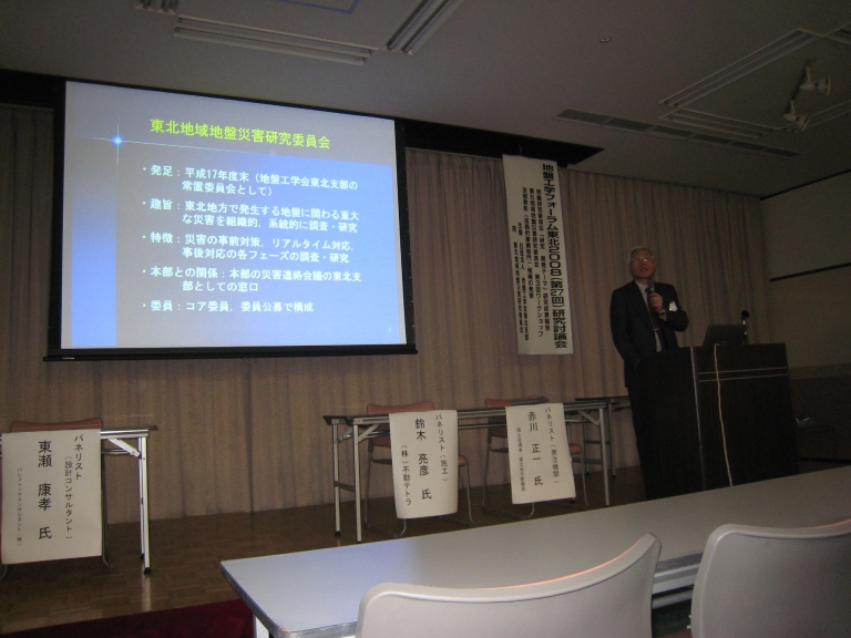 | つづいて,東北地域地盤災害研究委員会による 第3回ワークショップが開催されました. 今回は「東北地方における地盤・地質・地盤災害データベースシステムについて」と題し, 2件の基調講演では本委員会における活発な活動状況と成果が報告されました. また,パネルディスカッションも行われ,データベースシステムの現状と今後の進展について 活発な議論がなされました. |